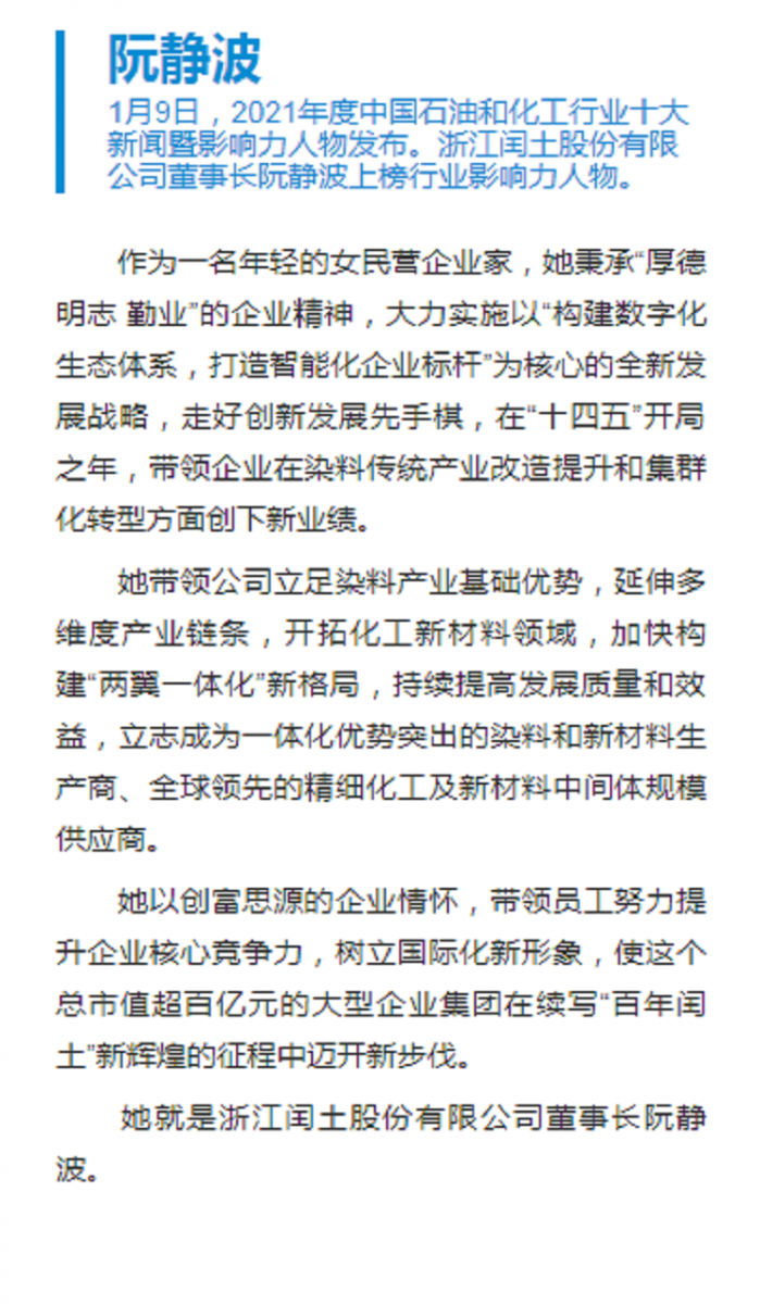 2022年1月9日,由中國石油和化學(xué)工業(yè)聯(lián)合會(huì)指導(dǎo),《中國化工報(bào)》社有限公司主辦的“2021年度石油和化工行業(yè)十大新聞暨影響力人物發(fā)布盛典”采用線上直播的形式舉行。浙江閏土股份董事長(zhǎng)阮靜波榮膺“2021年度中國石油和化工行業(yè)影響力人物”。